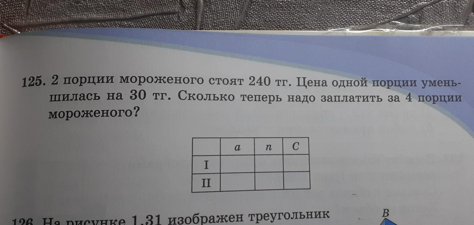 125. 2 порции мороженого стоят 240 тг. Цена одной порции умень- шилась на 30 тг. Сколько теперь надо заплатить за 4 порции мороженого? покажите в таблице пж