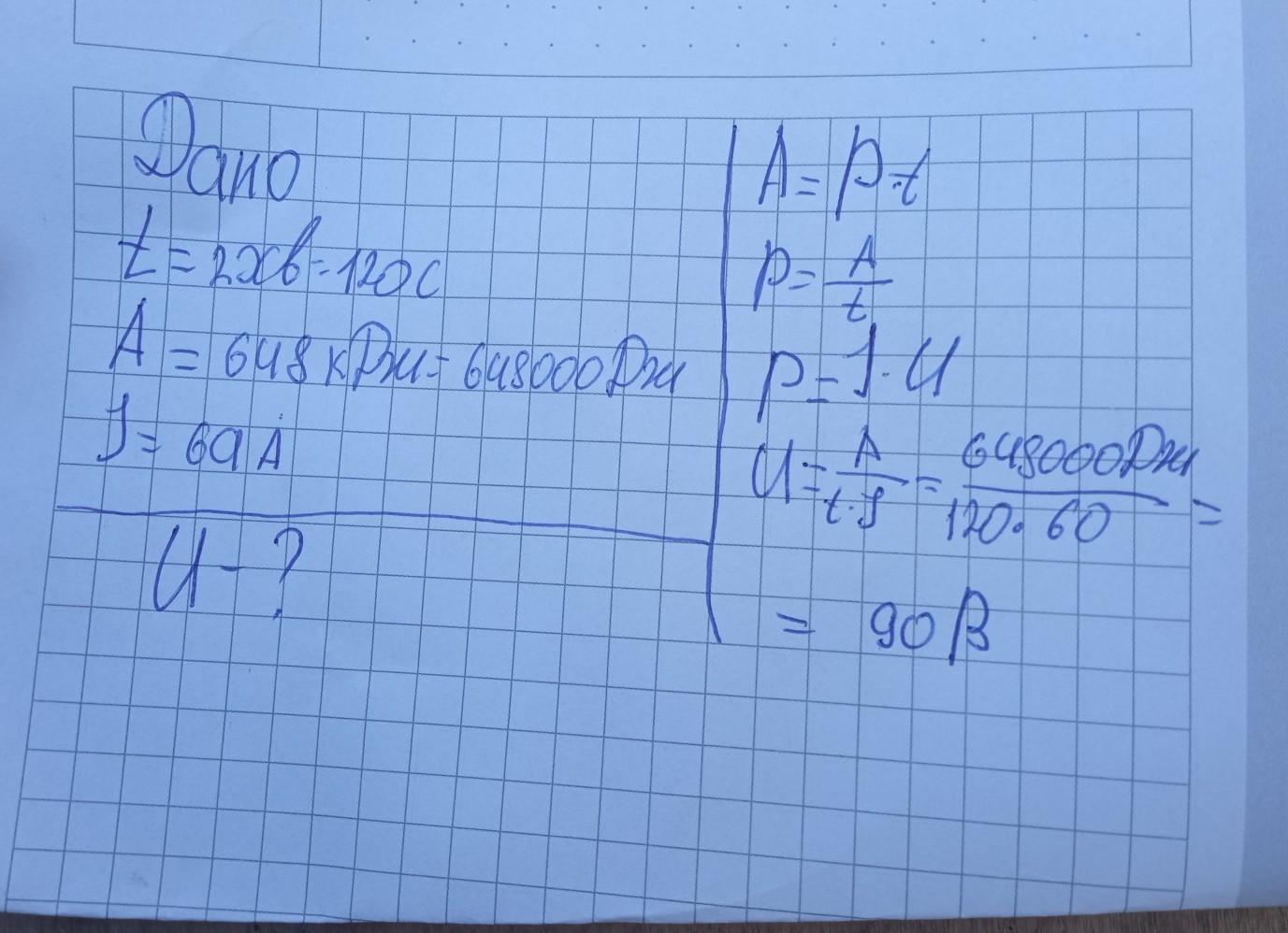 Двигун електронавантажувача за 2 хв здійснює роботу, рівну 648 кДж. Чому дорівнює напруга на клемах електродвигуна, якщо сила струму в його обмотці 60 А?