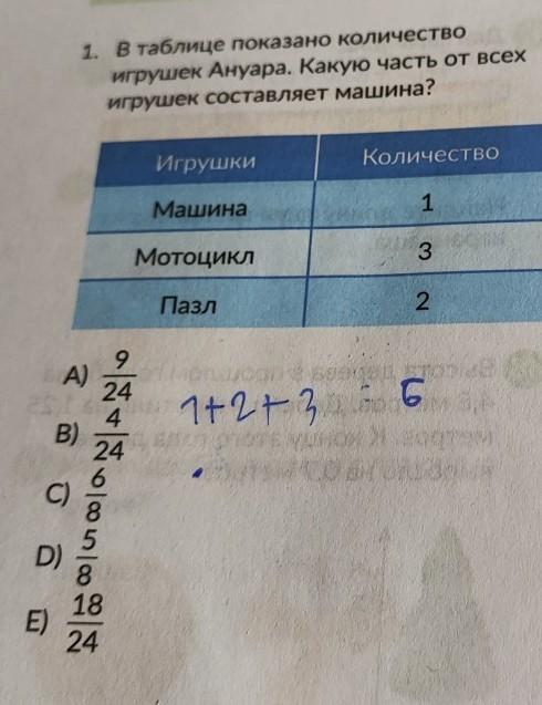 1. В таблице показано количество игрушек Ануара. Какую часть от всех игрушек составляет машина? B) C) A) 24 D) E) Игрушки Машина Мотоцикл Пазл al+/Tol@on/0 Закрепление и повторение ма 18 24 КоличествО 1 3 2 1+2+36 помогите плиз даю 7 баллов