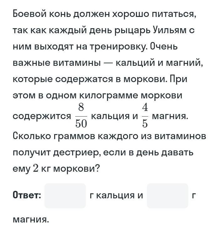 Боевой конь должен хорошо питаться, так как каждый день рыцарь Уильям с ним выходят на тренировку. Очень важные витамины — кальций и магний, которые содержатся в моркови. При этом в одном килограмме моркови 8 4 содержится кальция и магния. 50 5 Сколько граммов каждого из витаминов получит дестриер, если в день давать ему 2 кг моркови? Ответ: ? магния. г кальция и Г?