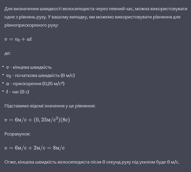 Отже, кінцева швидкість велосипедиста через 8 секунд руху під ухилом з прискоренням 0.25 м/с² становить 8 м/с.