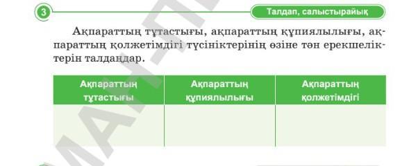3 Талдап, салыстырайық Ақпараттың тұтастығы, ақпараттың құпиялылығы, ақ- параттың қолжетімдігі түсініктерінің өзіне тән ерекшелік- терiн талдандар. Акпараттың тұтастығы ЛА Акпараттың кұпиялылығы Акпараттын қолжетiмдiгi.