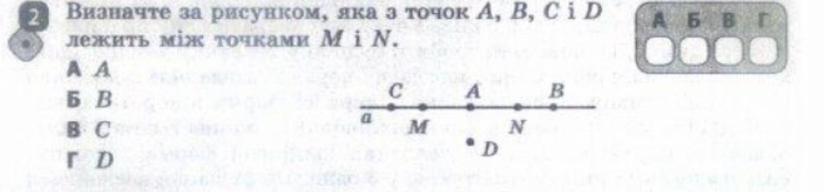 Визначте за рисунком, яка з точок А, B, С і D лежить між точками M iN.