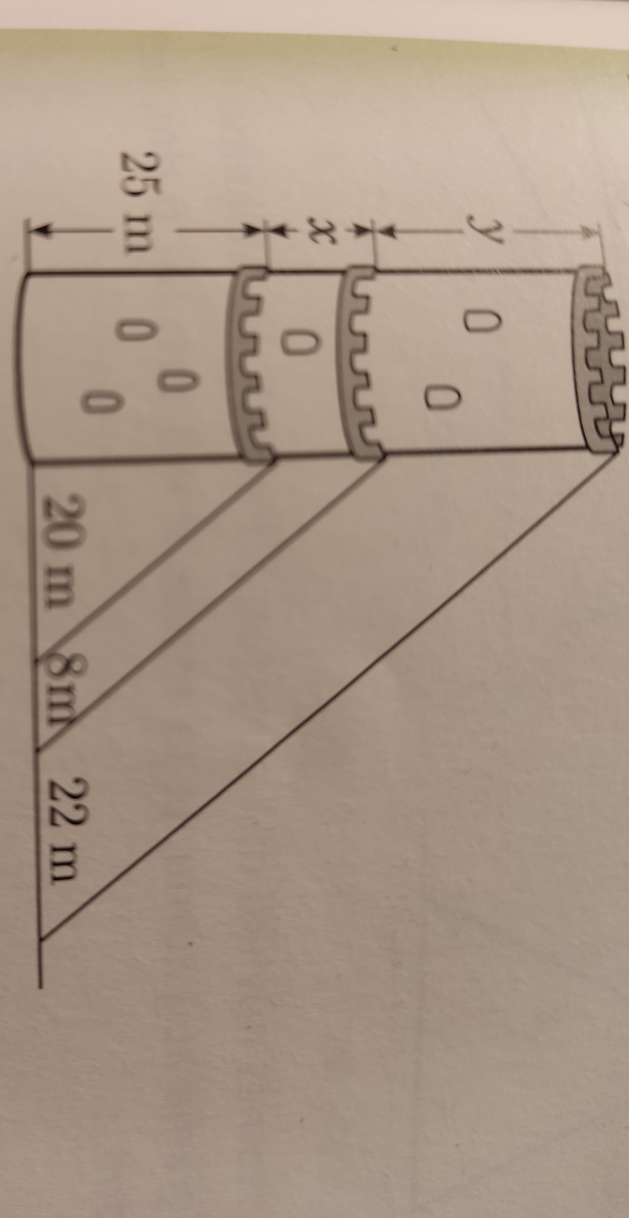 Длины теней секций замковой башни показаны на рисунке. Вычислите высоты x и y секций башни.
