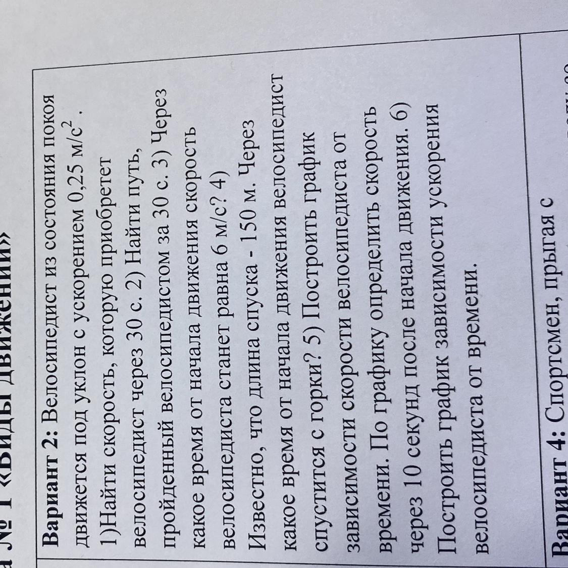 Решите пожалуйста: Вариант 2: Велосипедист из состояния покоя движется под уклон с ускорением 0,25 м/с.