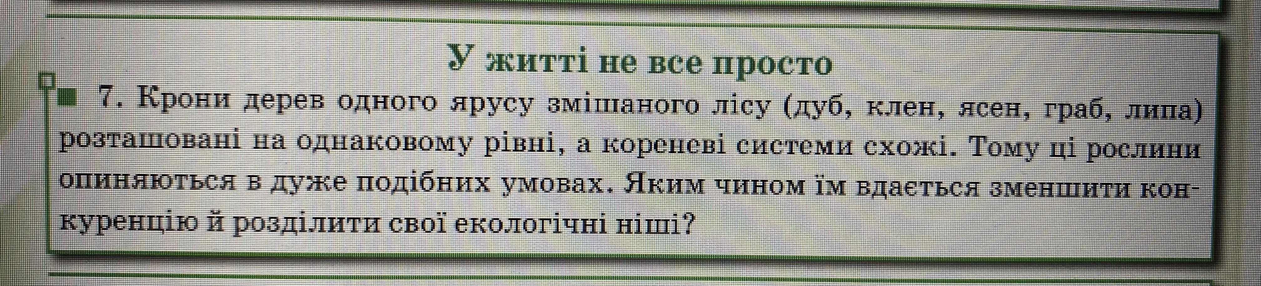 Рослини одного ярусу змішаного лісу, такі як дуб, клен, ясен, граб і липа, можуть зменшити конкуренцію і розділити екологічні ніші завдяки різним стратегіям, таким як використання різних ресурсів і адаптація до різних умов середовища.