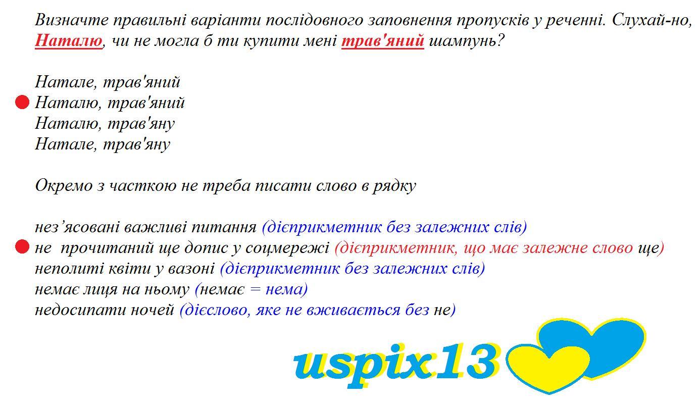 Визначте правильні варіанти послідовного заповнення пропусків у реченні. Слухай-но, __________, чи не могла б ти купити мені __________ шампунь? * 1 бал Натале, трав'яний Наталю, трав'яний Наталю, трав'яну Натале, трав'яну