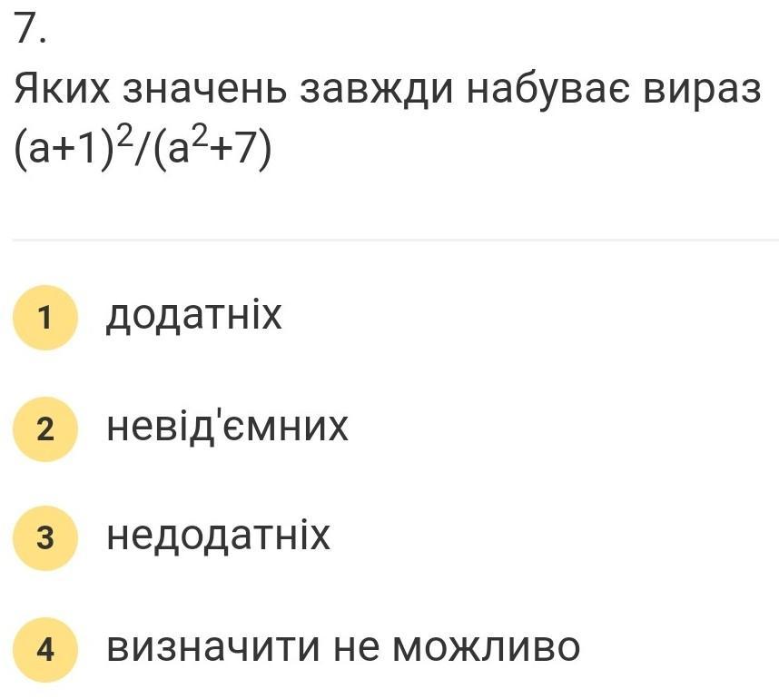 Вираз завжди набуває додатніх значень, оскільки (a+1)² та (a²+7) завжди є додатними числами. Квадрат будь-якого числа завжди є додатним, і сума додатнього числа (1) і будь-якого числа a залишається додатньою. Таким чином, обидва чисельник і знаменник виразу завжди додатні, і результат ділення буде також додатнім числом.