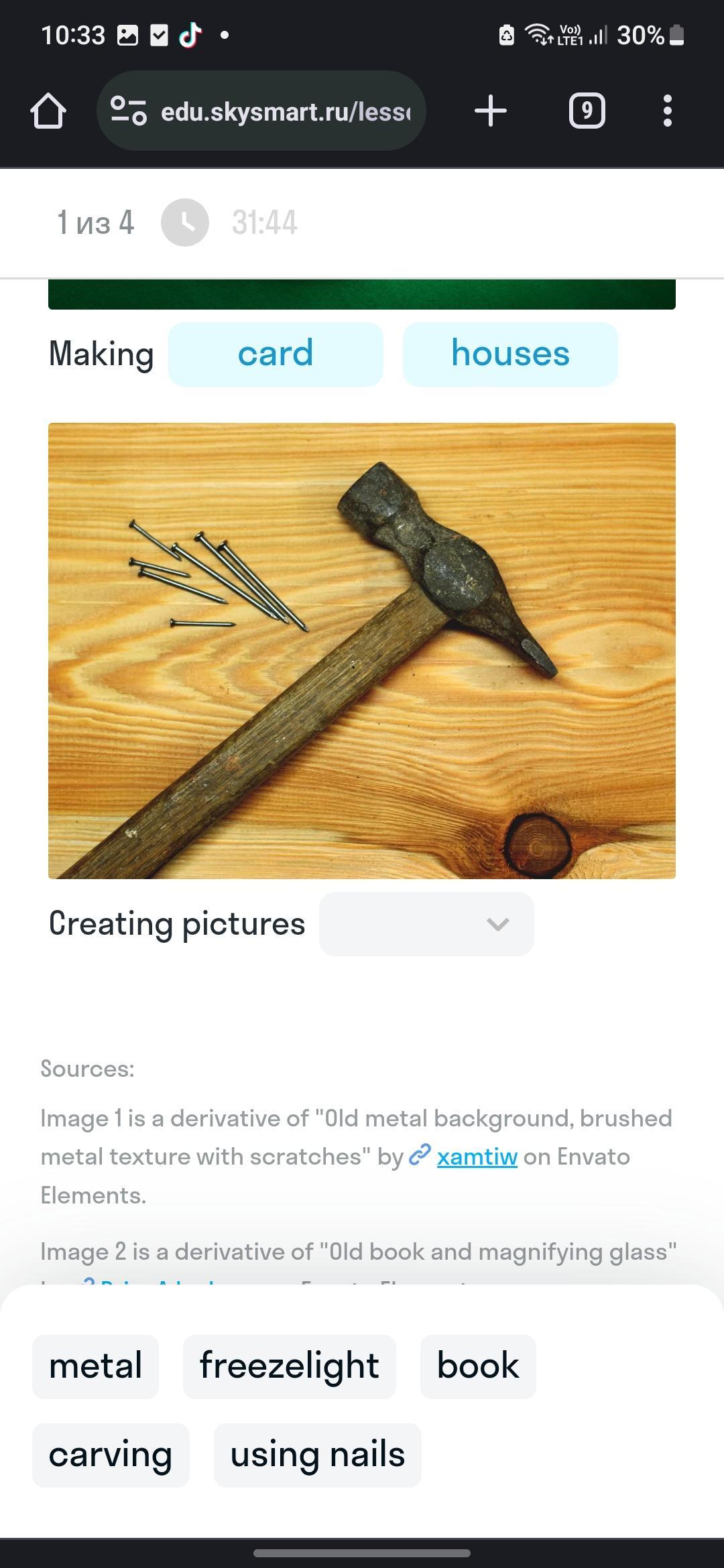Правильный ответ: «metal», что переводится как «металл», и подходит к данной картинке, на которой изображены металлические молоток и гвозди