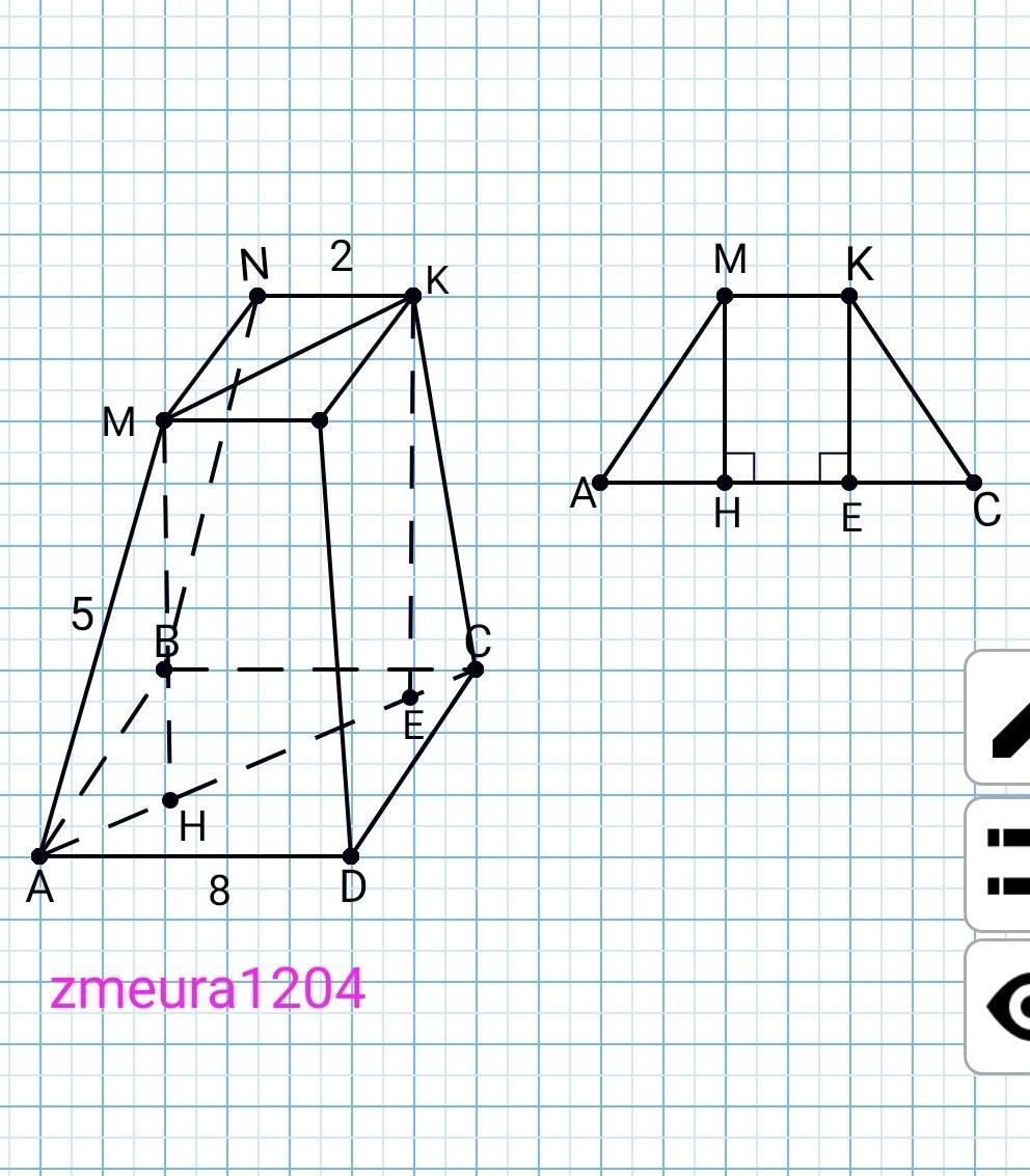 Бічне ребро правильної чотирикутної зрізаної піраміди дорівнює 5 см, а сторони основ– 2см і 8 см.