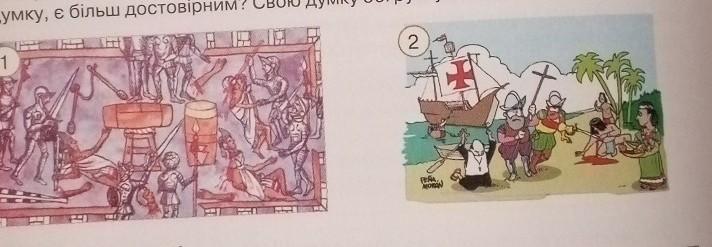 2. Зіставте малюнок XVI ст., що зображує Конкісту (1), і сучасну карикатуру (2). Виокреміть спільні й відмінні риси в змiстi зображень. Яке з них, на вашу думку, є більш достовірним? Свою думку обгрунтуйте.