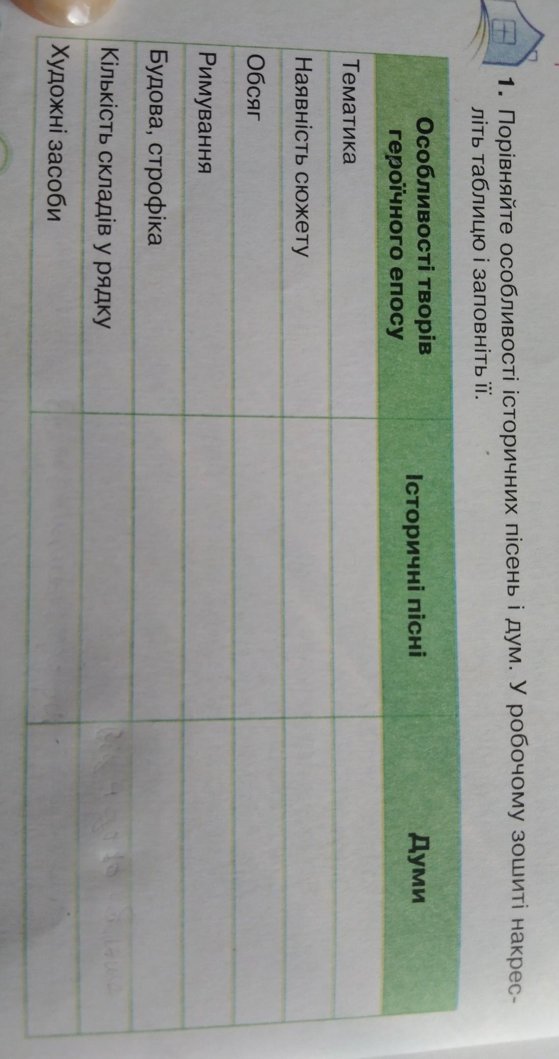 1. Порівняйте особливості історичних пісень і дум. У робочому зошиті накрес- літь таблицю і заповніть її. "Маруся Богуславка" Все на фото, допоможіть будь ласка :)