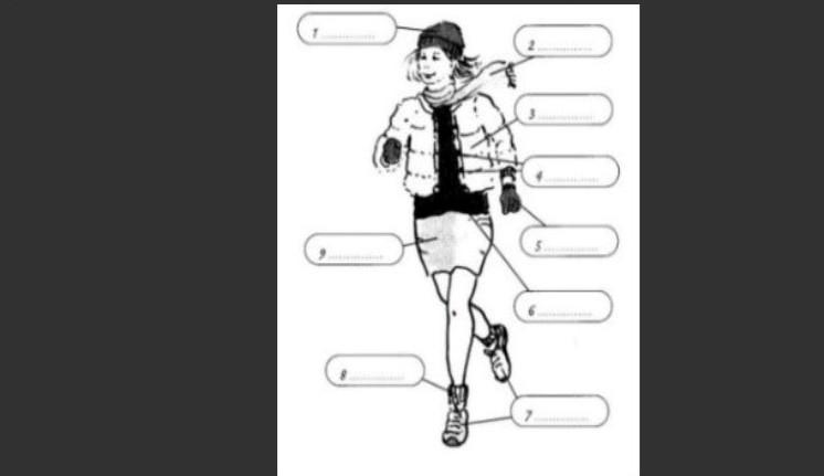 Ответ:1 шляпа 2шарф 3 куртка 4 кофта 5 рукавица 6 Нижняя кофта 7 брюки 8 носки 9 юбка