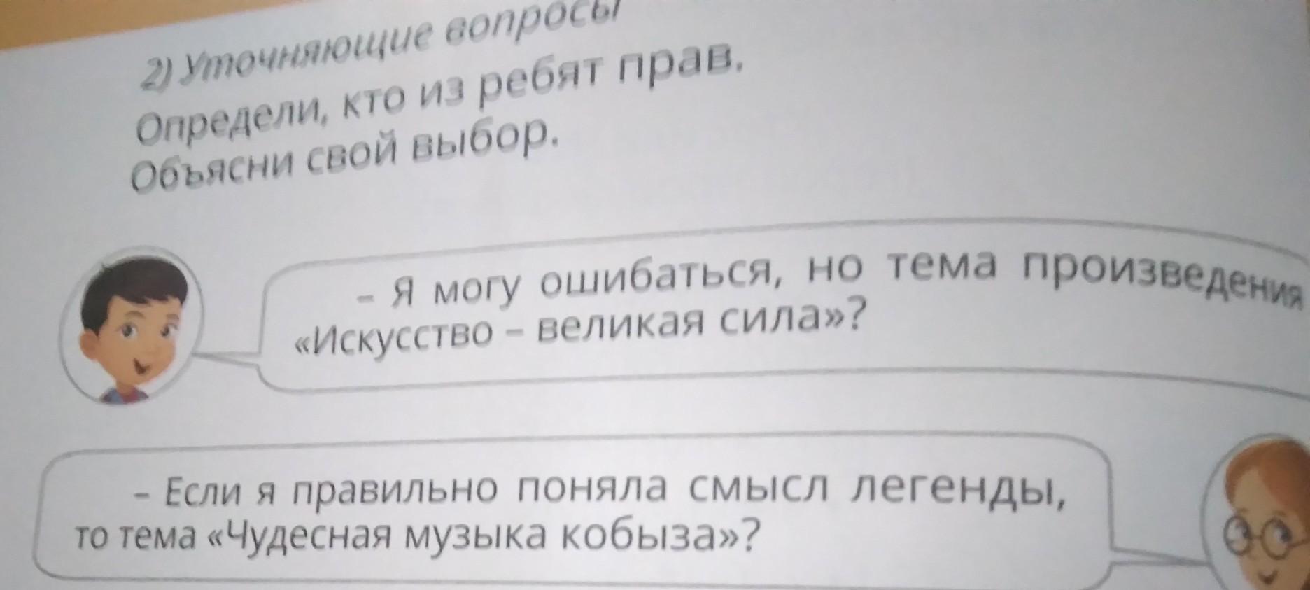 2) Уточняющие вопросы Определи, кто из ребят прав. Объясни свой выбор. - Я могу ошибаться, но тема произведения искусство великая сила ? или если я правильно поняла смысл легенды то тема чудесная музыка кобыза ? help