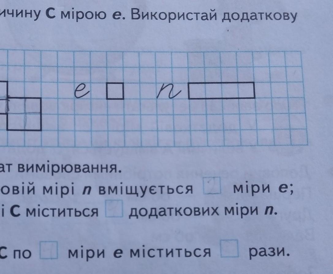 37. Виміряй величину С мірою е. Використай додаткову mipy n. C еп Запиши результат вимірювання. n У додатковій мірі п вміщуєтьсямiри е; У величині С міститься додаткових міри п. Або: У величині С по міри е міститься рази.