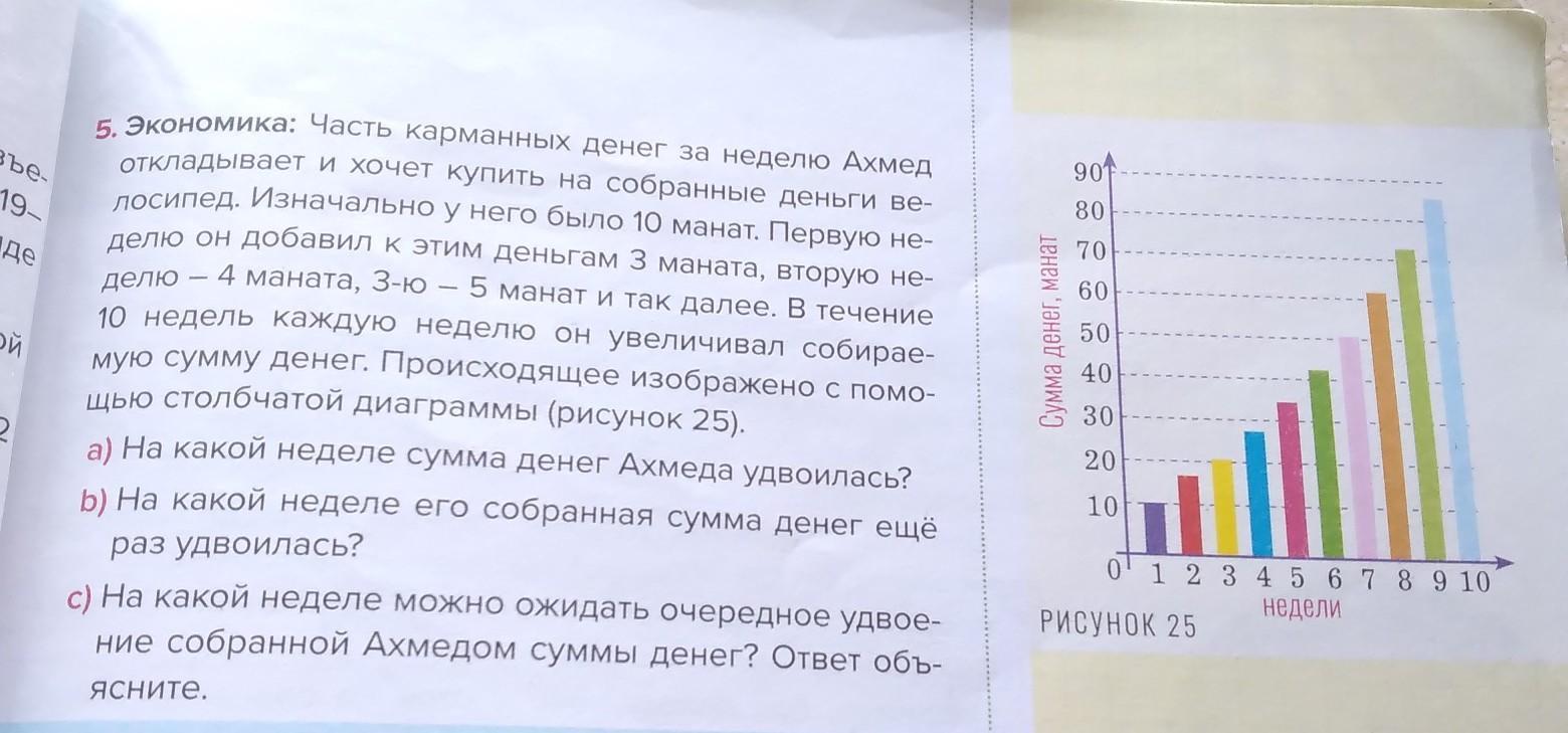 Ре 31 5. Экономика: Часть карманных денег за неделю Ахмед откладывает и хочет купить на собранные деньги ве- лосипед. Изначально у него было 10 манат. Первую не- делю он добавил к этим деньгам 3 маната, вторую не- делю – 4 маната, 3-ю – 5 манат и так далее. В течение 10 недель каждую неделю он увеличивал собирае- мую сумму денег. Происходящее изображено с помо- щью столбчатой диаграммы (рисунок 25). -