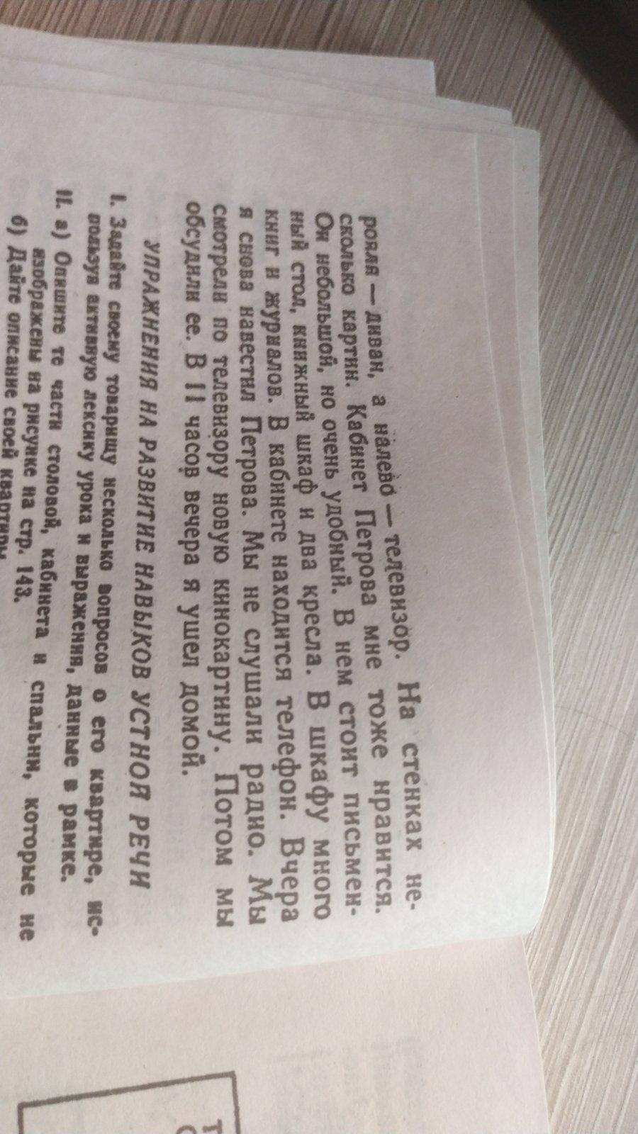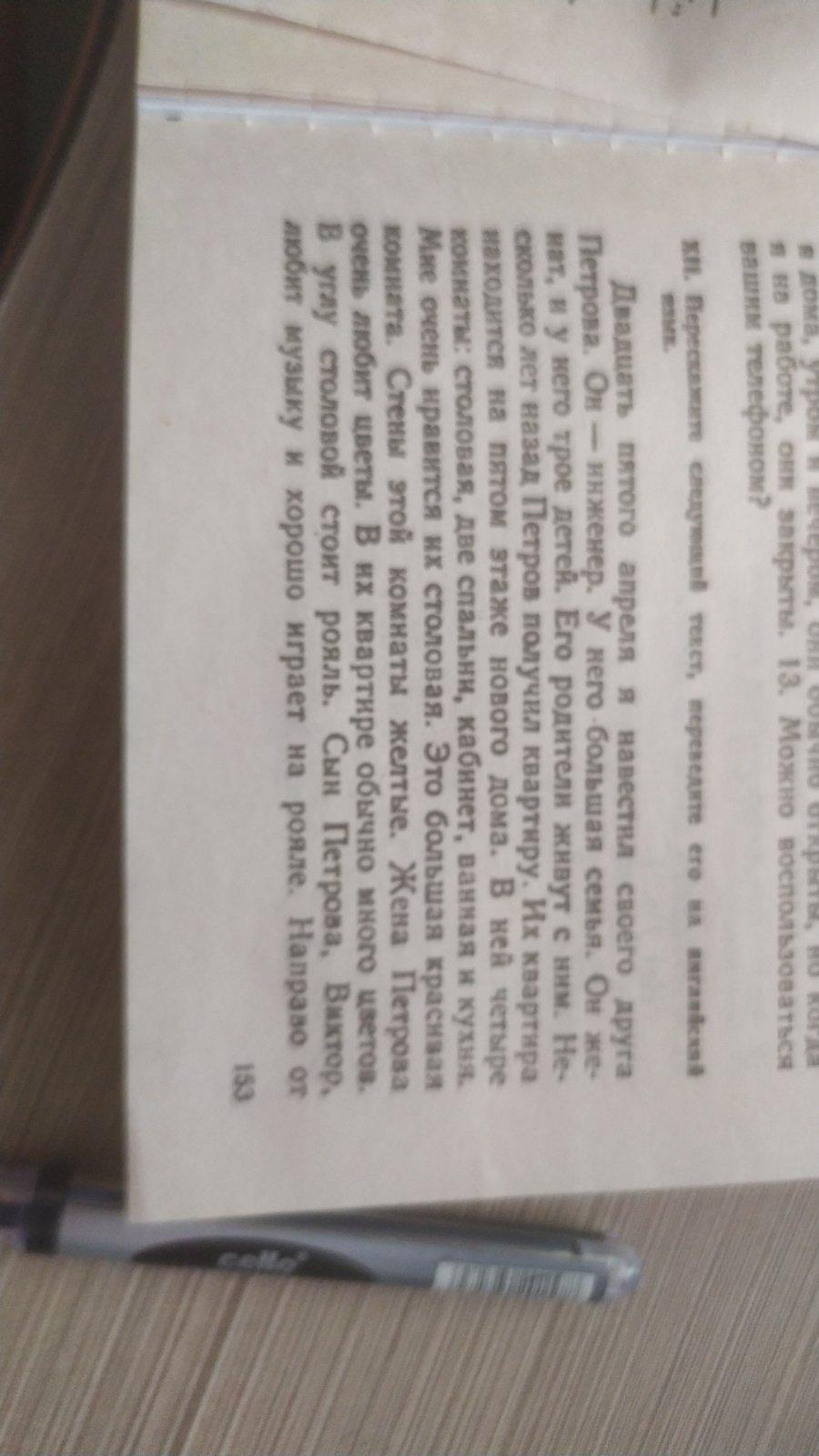 On the twenty-fifth of April I visited my friend Petrov. He is an engineer. He has a big family. He's a Nat, and he has three children. His parents live. Several years ago Petrov received an apartment. Their apartment is on the fifth floor of a new building. It has four rooms: a dining room, two bedrooms, an office, a bathroom and a kitchen. I really like their dining room. This is a big beautiful room. The walls of this room are yellow. Petrov's wife loves flowers very much. There are usually a lot of flowers in their apartment. There is a piano in the corner of the dining room. Petrov's son, Victor. loves music and plays the piano well. To the right ofnext to the piano is a sofa, and to the left is a TV. There are several paintings on the walls. I also like Petrov’s office. It's not big but very comfortable. It contains a desk, a bookcase and two armchairs. There are a lot of books and magazines in the closet. There is a telephone in the office. Yesterday I visited Petrov again. We didn't listen to the radio. We watched a new movie on TV. Then we discussed it. At 11 pm I went home.
