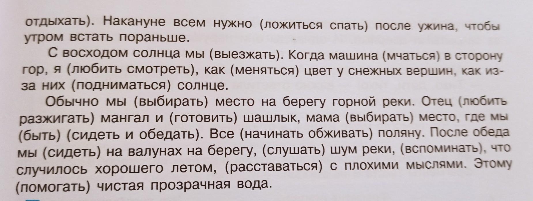 Накануне всем нам нужно лечь спать после ужина, чтобы утром встать пораньше. С восходом солнца мы выезжаем. Когда машина мчится в сторону гор, я люблю смотреть, как меняется цвет у снежных вершин, как из-за них поднимается солнце. Обычно мы выбирает место на берегу горной реки. Отец любит разжигать мангал и готовить шашлык, мама выбирает место, где мы будем сидеть и обедать. Все начинают обживать поляну. После обеда мы сидим на валунах на берегу, слушаем шум реки, вспоминаем, что случилось хорошего летом, расстаёмся с плохими мыслями. Этому помогает чистая прозрачная вода.