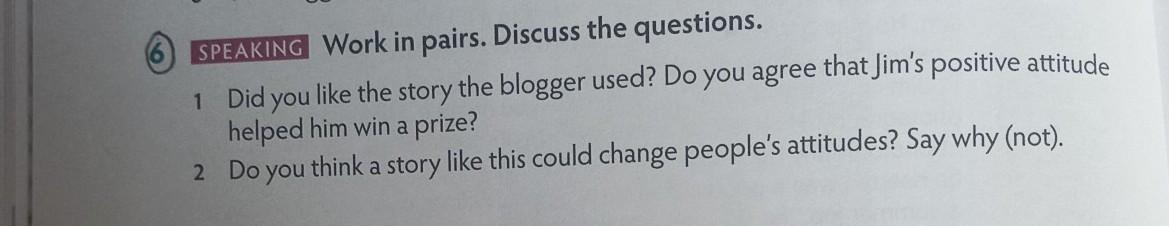 SPEAKING Work in pairs. Discuss the questions. 1 Did you like the story the blogger used? Do you agree that Jim's positive attitude helped him win a prize? 2 Do you think a story like this could change people's attitudes? Say why (not). помагитееее пжпжпжпж