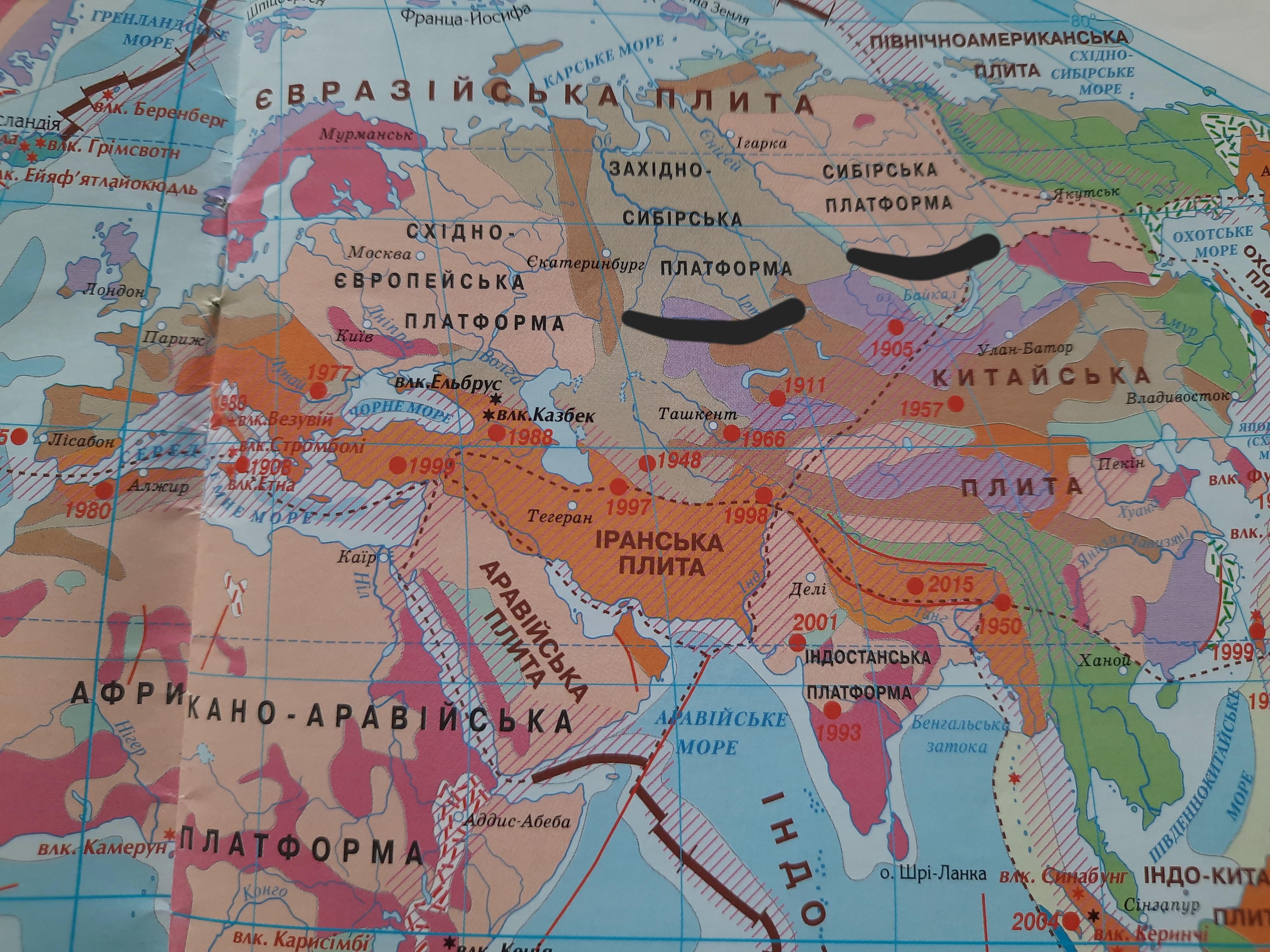 Прикріплене фото, де показано на тектонічній карті потрібні вам платформи.