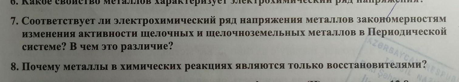 7.Электрохимический ряд напряжения металлов (или ряд электропотенциалов) представляет собой упорядоченный список металлов по их способности выступать в химических реакциях окисления и восстановления. Этот ряд используется для определения, какие металлы будут образовывать ионные соединения, а какие будут выделяться в виде металлического осадка в электрохимических процессах, таких как гальванические элементы.