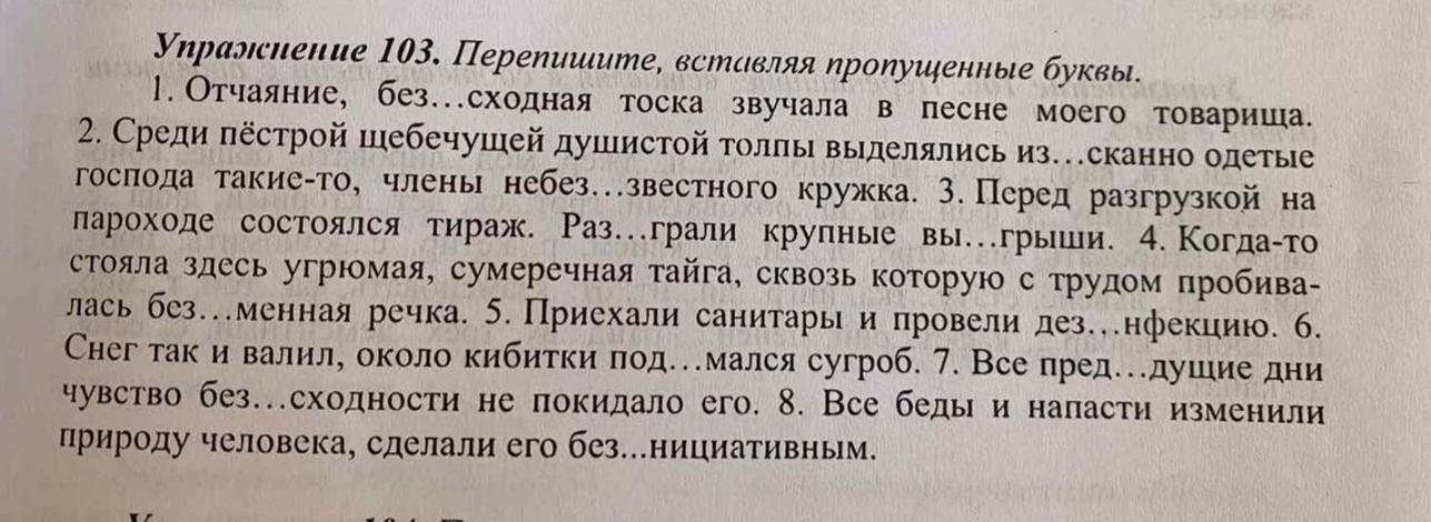 2. Среди пёстрой щебечущей душистой толпы выделялись из...сканно одетые господа такис-то, члены небез...звестного кружка. 3. Перед разгрузкой на пароходе состоялся тираж. Раз...грали крупные вы...грыши. 4. Когда-то стояла здесь угрюмая, сумеречная тайга, сквозь которую с трудом пробива-лась без...менная речка. 5. Приехали санитары и провели дез...нфекцию. 6.