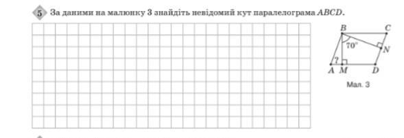 Ми можемо спочатку знайти кут D, для цього ми розглянемо чотирикутник MBND. Сума кутів у чотирикутників 360⁰. Ми знаємо, що в куті DMB 90⁰, ВN - висота, тому кут BND - 90⁰. Щоб знайти D треба від суми всіх кутів (360⁰) відняти всі інші. Кут D=360⁰- DMB - BND - MBN=360-90-90-70=110⁰. За властивістю кутів паралелограма ми знаємо, що сума кутів прилеглих до однієї сторони 180⁰. А=180⁰-D=180-110=70⁰