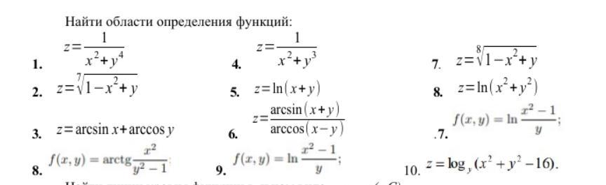 Здравствуйте. Помогите пожалуйста решить ЛЮБОЙ из этих примеров. Очень запуталась. Найти область определения функций двух переменных. Желательно с объяснением хотя бы коротеньким. Спасибо большое за прочтение и помощь.