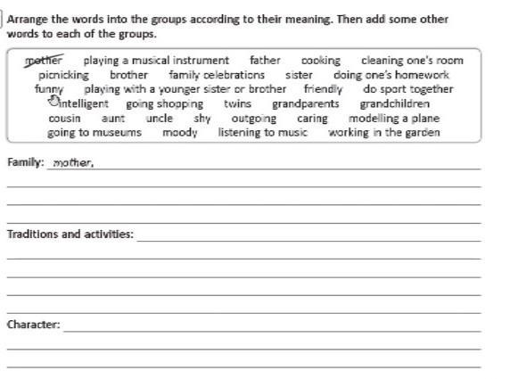 Traditions and activities: Playing musical instruments, cleaning one's room, picnicking, family celebrations, doing one's homework, going shopping, outgoing, modeling a plane, going to museum, listening to music, working in the garden, + help with household chores.