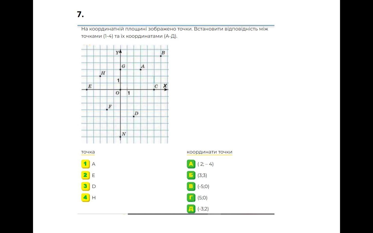 На координатній площині зображено точки. Встановити відповідність між точками (1-4) та їх координатами (А-Д). E точка 1 2 3 4 координати точки A (2;-4) Б(3;3) B(-5;0) Г (5;0) Д(-3;2)