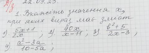 Ответ: 1) Всі, окрім х=0 ; 2) Всі, Окрім х = 11 ; 3) Всі, окрім х = 1,5 ; 4) Тут змінної х немає, але змінна а≠2