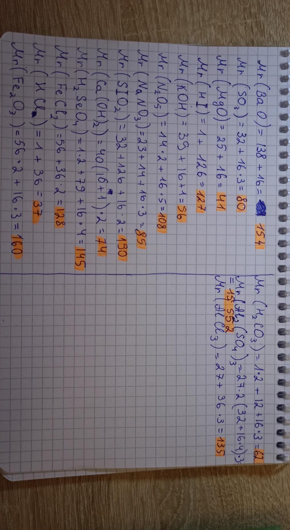 Знайдіть відносні молекулярні маси речовин: BaO,SO3,MgO,HI,KOH,N2O5,NaNO3,SIO2,Ca(OH)2,H2SeO4,FeCI2,HCI,Fe2O3,H2CO3,AI2(SO4)3,AICI3