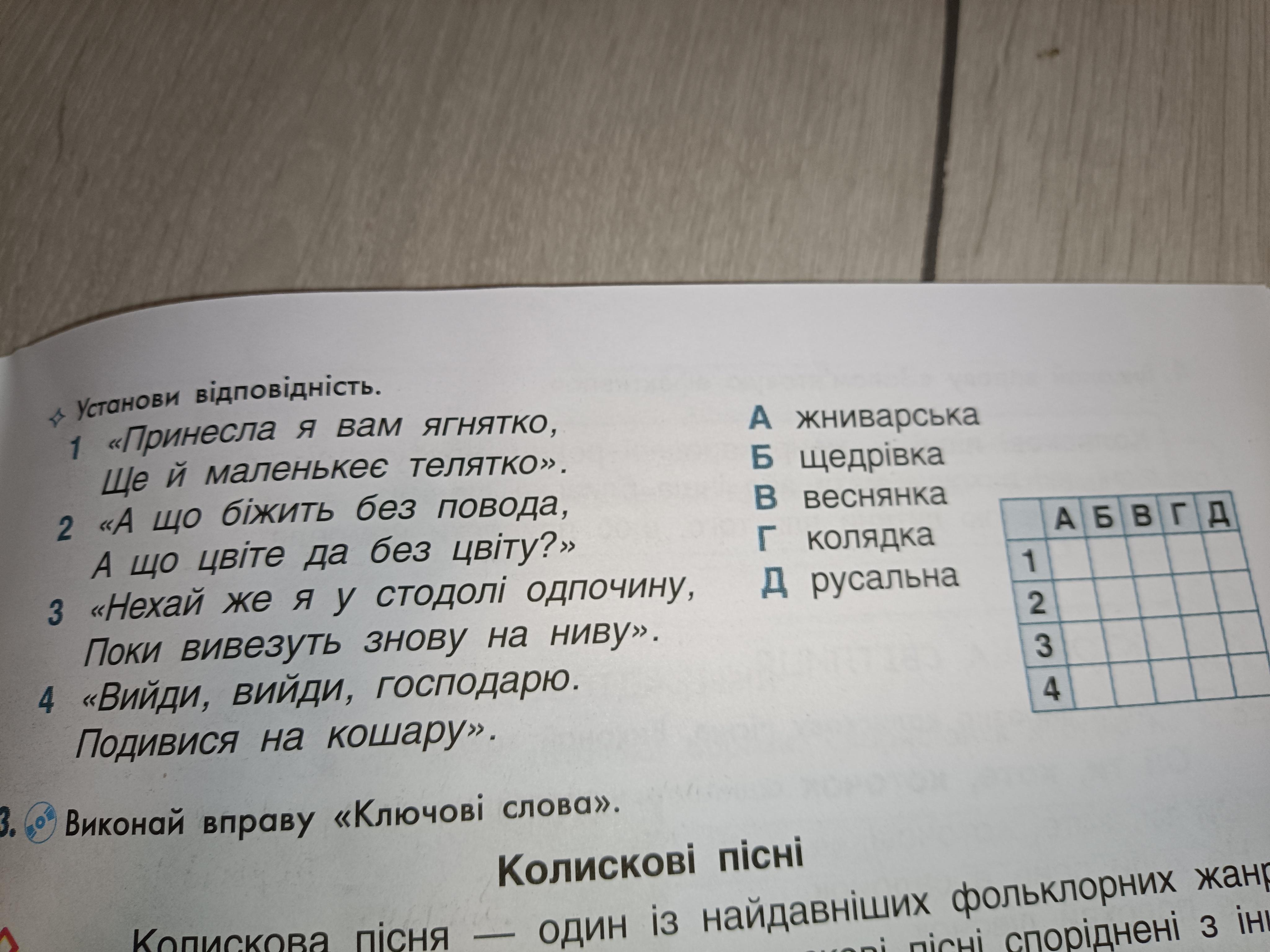 1-веснянка 2-русальня 3 -жниварська 4-щедрівка