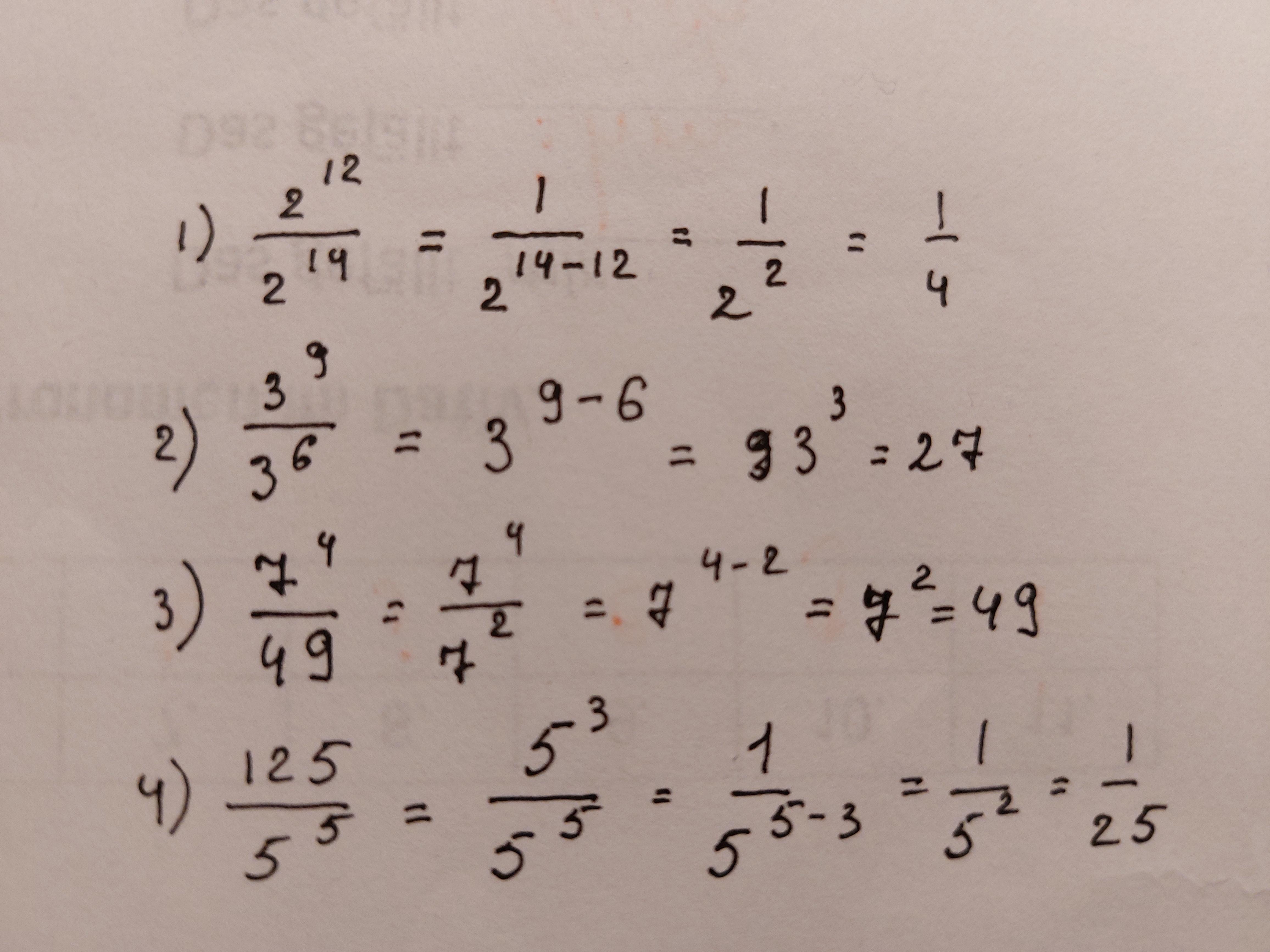 56. Обчисліть значення виразу: 1) (2 ^ 12)/(2 ^ 14) 2) (3 ^ 9)/(3 ^ 6) 3) (7 ^ 4)/49 4) 125/(5 ^ 5)