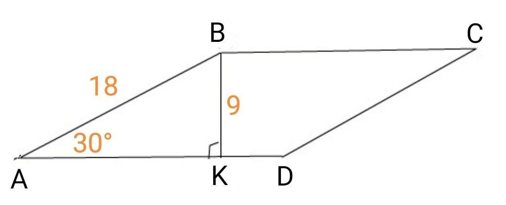 4) Дано паралелограм АВСД. Висота ВК=9 см, кут А=30°. Знайти сторони паралелограма, якщо його периметр дорівнює 76 см