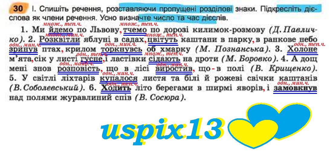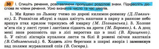 2. Розквітли яблуні в садах, цвітуть каштани в парку, в ранкове небо зринув птах, крилом торкнувсь об хмарку (М. Боровко). 4. А дощ мені знов розповість, що в лісі виростив, що в полі (В. Крищенко). 5. У світлі ліхтарів, купалося листя та білі й рожеві свічки каштанів (В. Соболевський). 6. Ходить літо берегами, в ширмі яворів, і замовкнув над полями журавлиний спів (В. Сосюра).