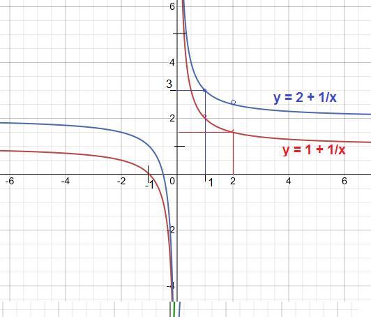 График функции у = 2 + 1/х будет смещен вверх по оси ординат у на 1 ед., т.к. (а=2 > а=1 на 1).