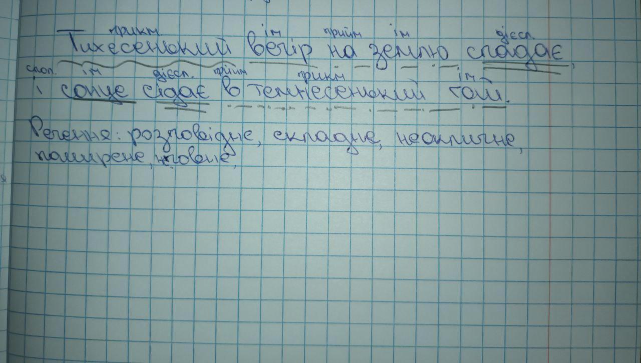 11. Зробіть синтаксичний розбір речення. Зазначте вид речення за метою висловлювання та за будовою. Тихесенький вечір на землю спадає, і сонце сідає в темнесенький гай.