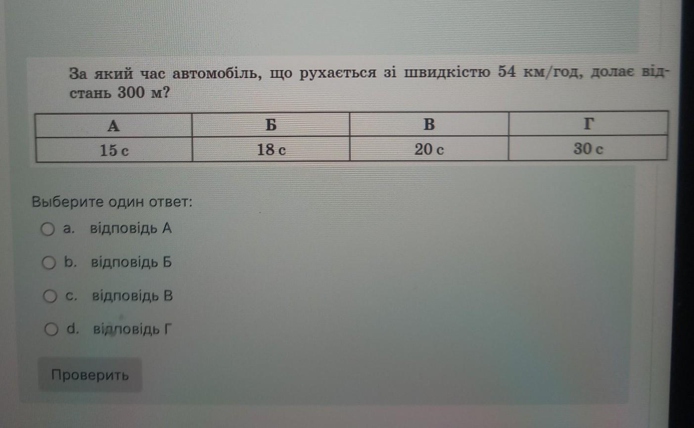 Отже, автомобіль пройде відстань 300 метрів за 20 секунд зі швидкістю 54 км/год.