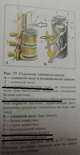 Спинномозговые узлы на рисунке А под номером 2, на рисунке Б под номером 4