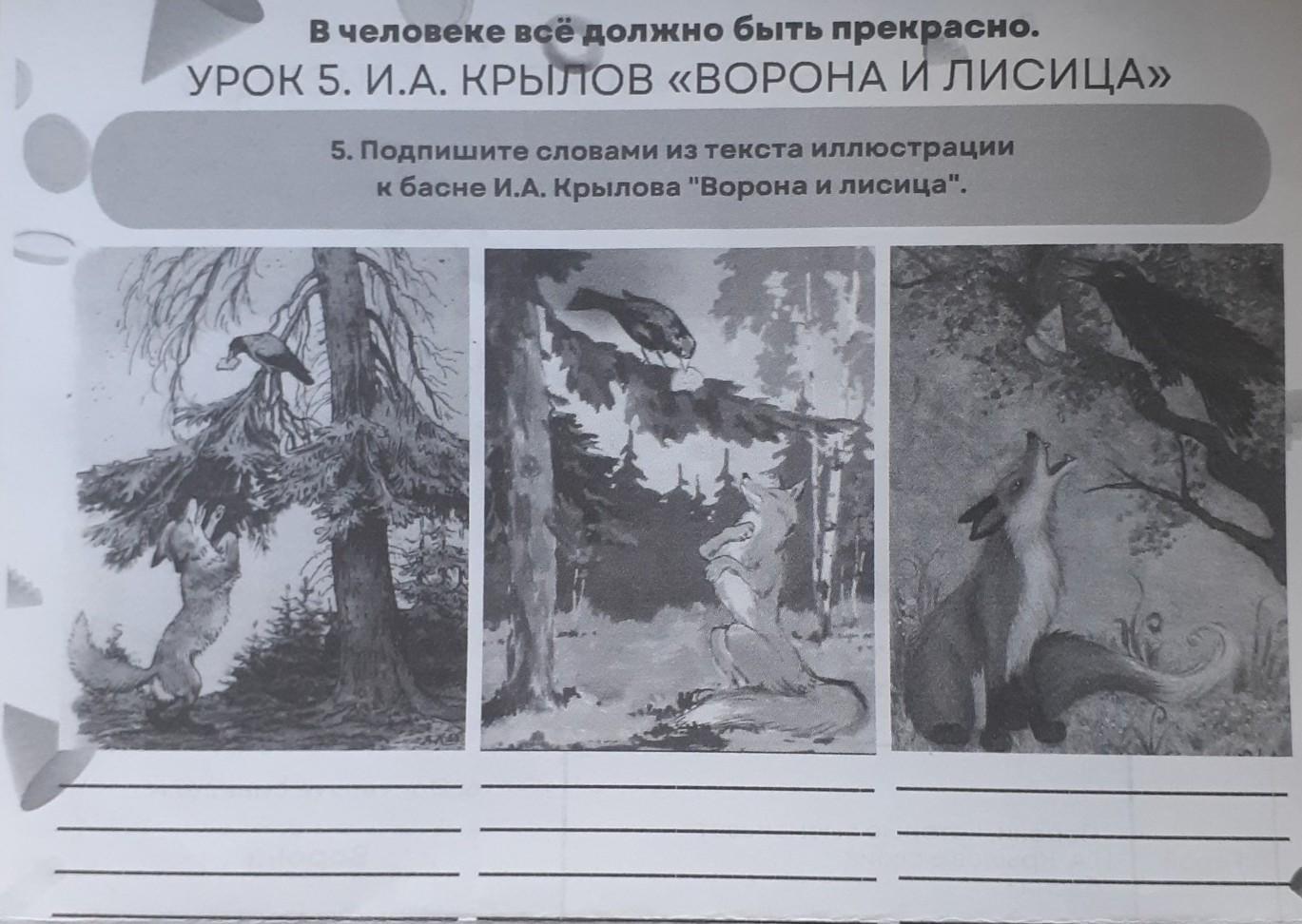 5. Подпишите словами из текста иллюстрации к басне И.А. Крылова "Ворона и лисица".