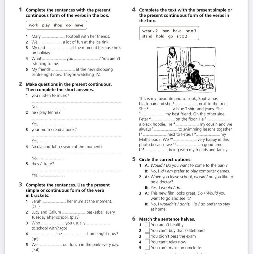 Ex2. 1. Are you listening to music? No, I'm not. 2. Is he playing tennis? Yes, he is. 3. Is your mum reading a book? Yes, she is. 4. Are Nicola and John swimming at the moment? No, they aren't. 5. Are they skating? Yes, they are.