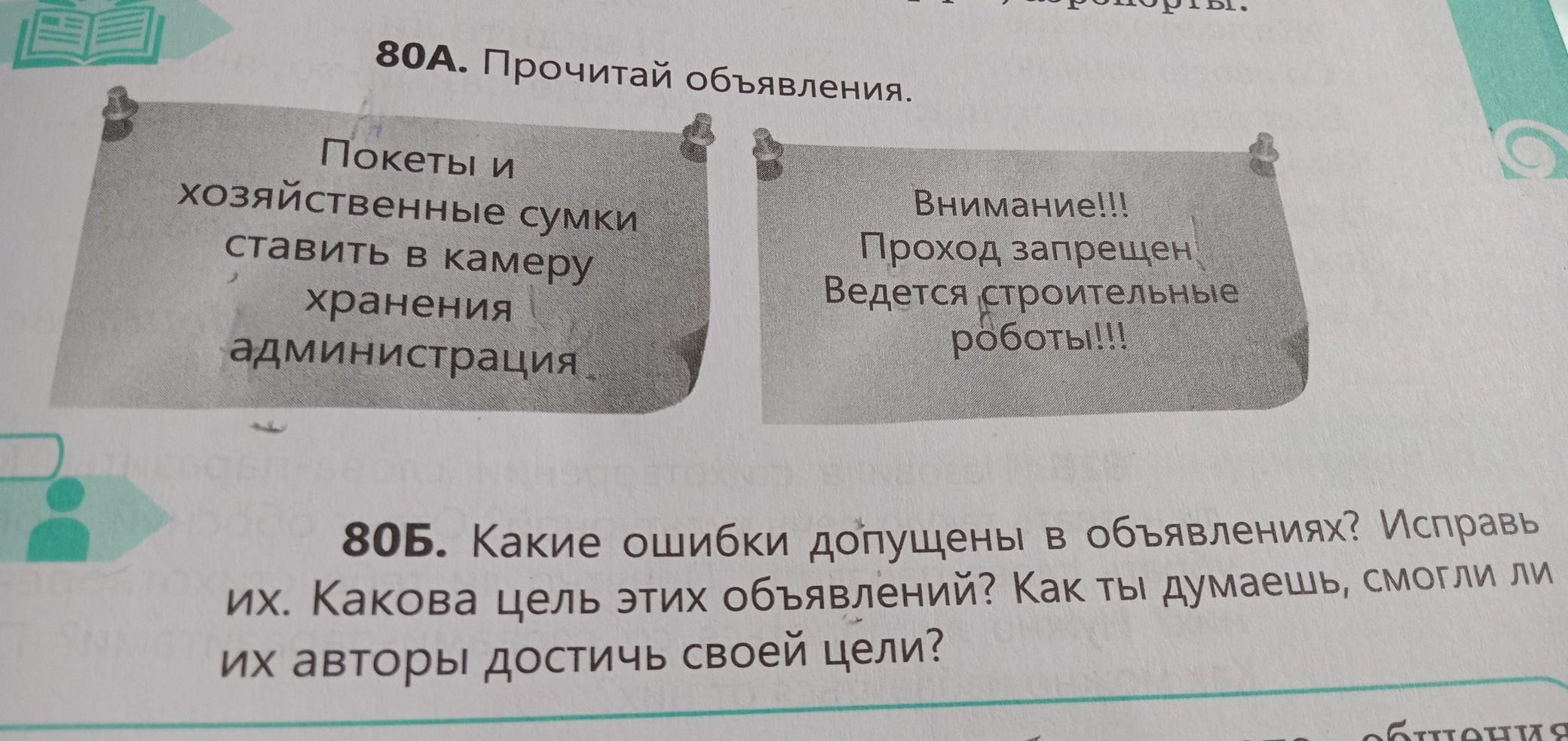 80А. Прочитай объявления. Покеты и хозяйственные сумки ставить в камеру хранения администрация Внимание!!! Проход запрещен Ведется строительные роботы!!! 80Б. Какие ошибки допущены в объявлениях? Исправь их. Какова цель этих объявлений? Как ты думаешь, смогли ли их авторы достичь своей цели?