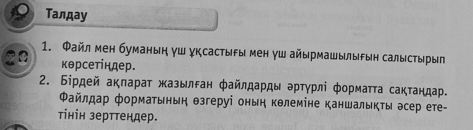 2. Бірдей ақпарат жазылған файлдарды әртүрлі форматта сақтаңдар. Файлдар форматының өгзгеруі оның көлеміне қаншалықты әсер ететінін зерттеңдер.