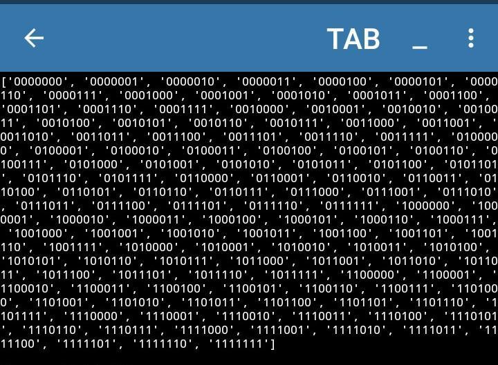 ['0000000', '0000001', '0000010', '0000011', '0000100', '0000101', '0000110', '0000111', '0001000', '0001001', '0001010', '0001011', '0001100', '0001101', '0001110', '0001111', '0010000', '0010001', '0010010', '0010011', '0010100', '0010101', '0010110', '0010111', '0011000', '0011001', '0011010', '0011011', '0011100', '0011101', '0011110', '0011111', '0100000', '0100001', '0100010', '0100011', '0100100', '0100101', '0100110', '0100111', '0101000', '0101001', '0101010', '0101011', '0101100', '0101101', '0101110', '0101111', '0110000', '0110001', '0110010', '0110011', '0110100', '0110101', '0110110', '0110111', '0111000', '0111001', '0111010', '0111011', '0111100', '0111101', '0111110', '0111111', '1000000', '1000001', '1000010', '1000011', '1000100', '1000101', '1000110', '1000111', '1001000', '1001001', '1001010', '1001011', '1001100', '1001101', '1001110', '1001111', '1010000', '1010001', '1010010', '1010011', '1010100', '1010101', '1010110', '1010111', '1011000', '1011001', '1011010', '1011011', '1011100', '1011101', '1011110', '1011111', '1100000', '1100001', '1100010', '1100011', '1100100', '1100101', '1100110', '1100111', '1101000', '1101001', '1101010', '1101011', '1101100', '1101101', '1101110', '1101111', '1110000', '1110001', '1110010', '1110011', '1110100', '1110101', '1110110', '1110111', '1111000', '1111001', '1111010', '1111011', '1111100', '1111101', '1111110', '1111111']