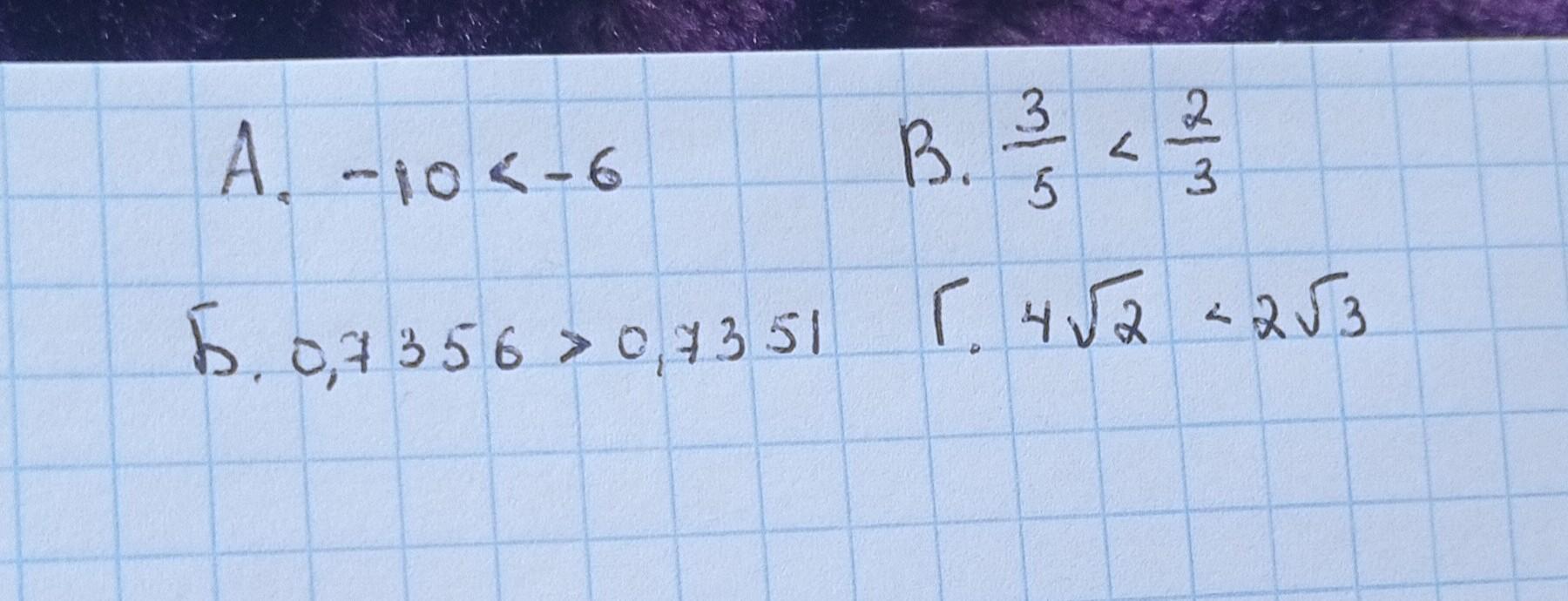 в) правильна, тому що 3/5 = 0,6, а 2/3 = 0,(6) 0,(6)>0,6