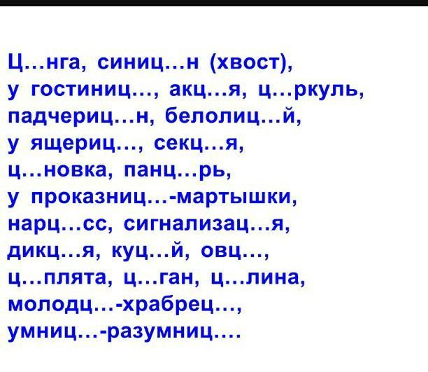 Цинга, синицын, у гостиницы, акция, циркуль, падчерицын, белолицый, у ящерицы, секция, циновка, панцирь, у проказницы- мартышки, нарцисс, сигнализация, дикция, куцый, овцы, цыплята, цыган, целина, молодцы-храбрецы, умницы-разумницы