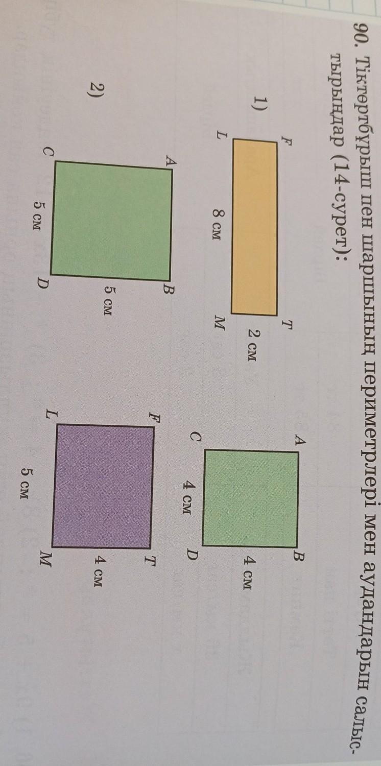 90. Тіктөртбұрыш пен шаршының периметрлерi мен аудандарын салыс- тырындар (14-сурет): 1) 2) F L С 8 см 5 см В 5 см D T M 2 см F L C 4 см 5 см B 4 cм D T 4 см M