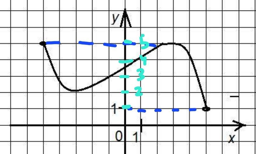 Пояснення: Область значень - це чила, які може приймати у. Тому дивитись на вісь Оу. Найменше значення-1, найбільше - 5