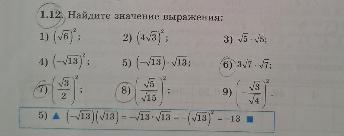 1) (√6)²³; 2) (4√3)²; 4) (-/13)3; 5) (-/13). /13; (7) 8) 5 √15 -/13./13 = -(√/13) 5) √3 2 2 ; (-/13)(/13) = - 2 3) √5-√5; 6) 3/7 ·/7; √√3 9) = -13 -